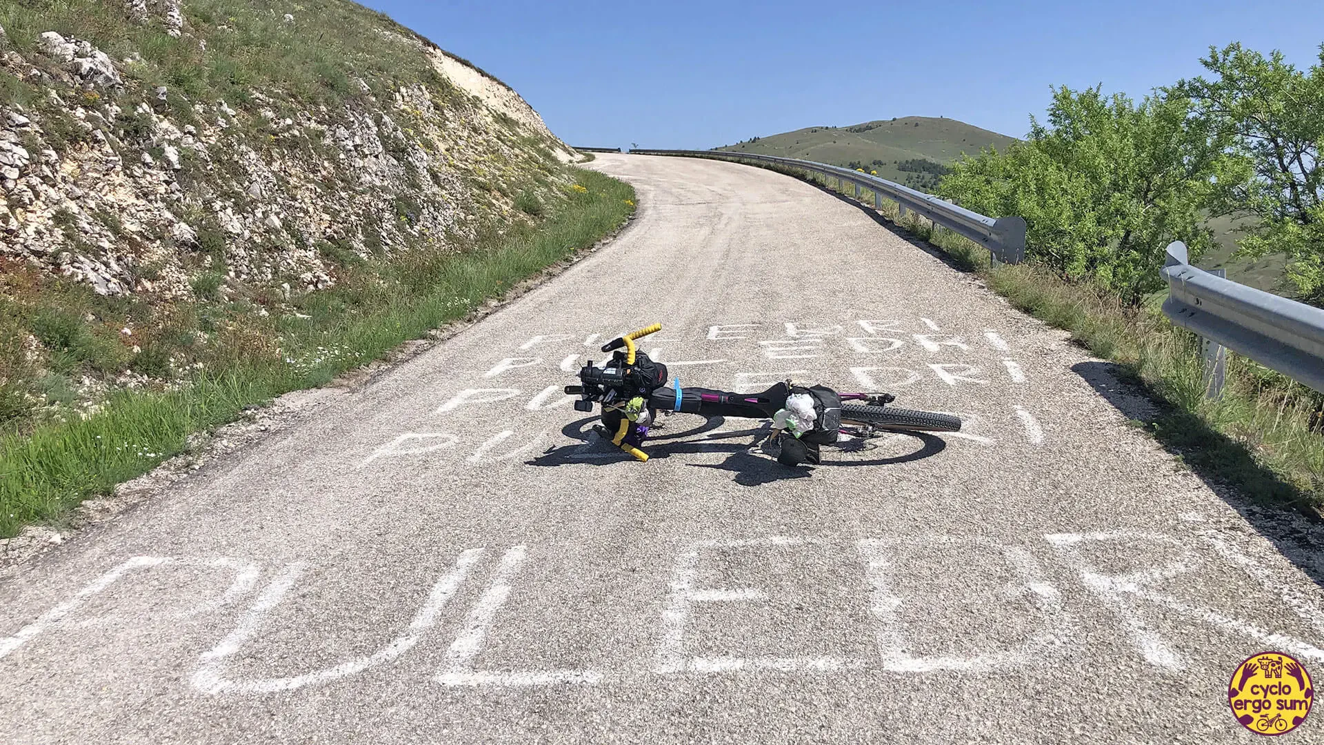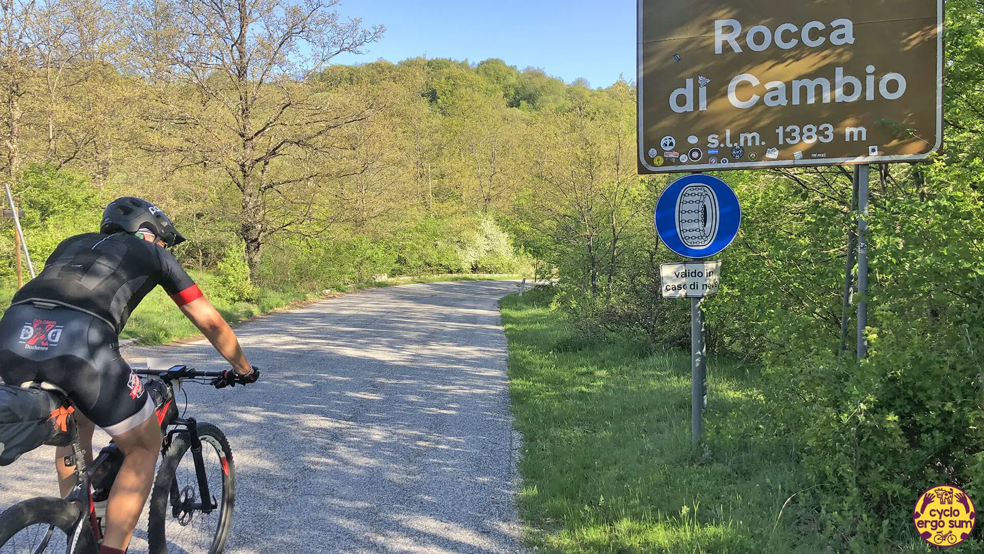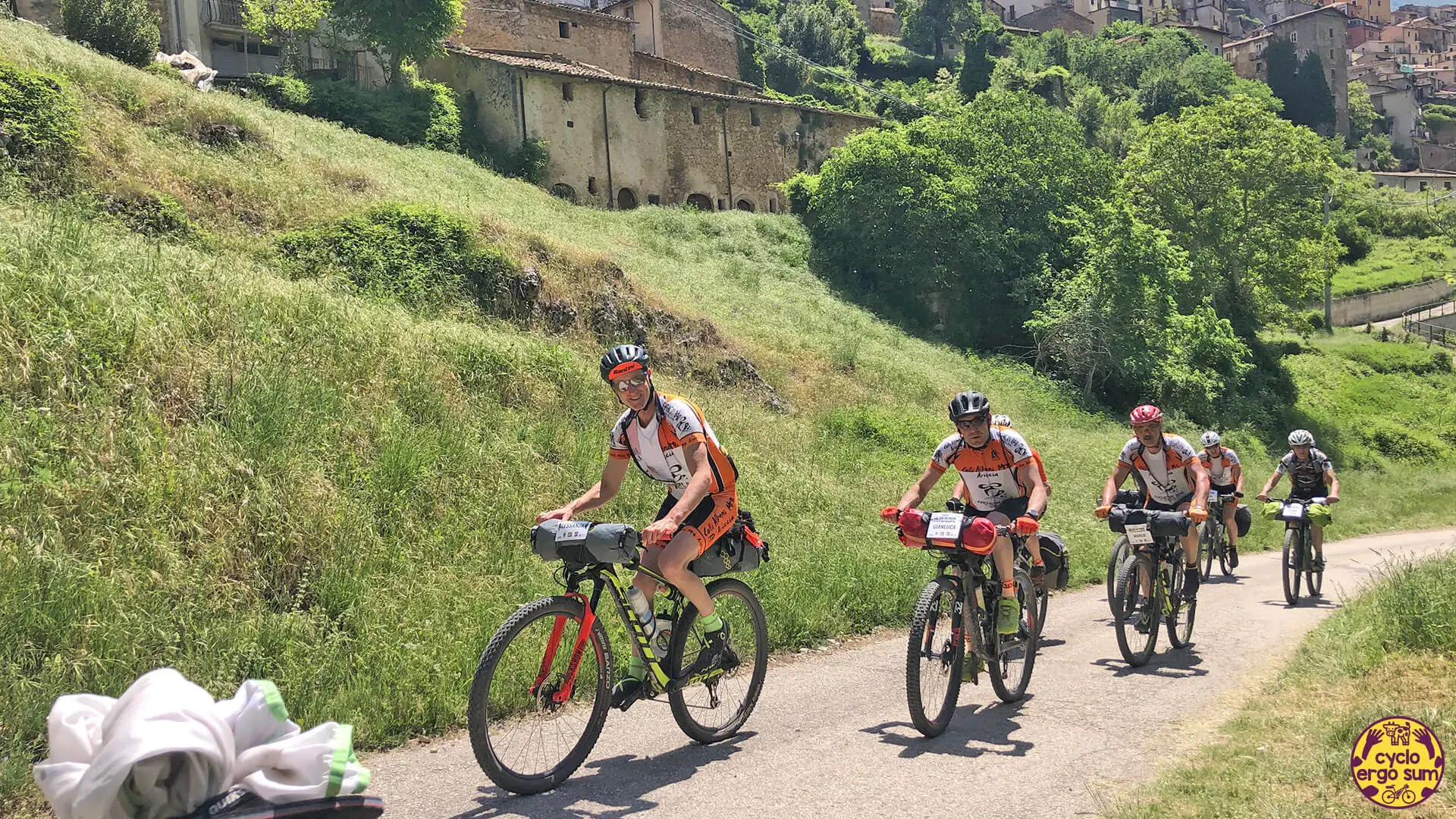 Dopo una sosta cena insieme a due partecipanti con i quali non ci facciamo mancare una buona birra e delle indimenticabili tagliatelle ai funghi, e dopo la notte in tenda a bordo lago, inizia un tratto di una spettacolarità unica: le Gole del Sagittario. La strada scende fino ad Anversa degli Abruzzi tra veloci curve, gallerie ed eremi antichi come quello di San Domenico. Ad Anversa ritrovo con piacere Simona, la Rossa a pedali, che mi accompagna pazientemente per un tratto di sterrate e salite fino a Goriano Sicoli, chiacchierando con grande piacere del suo Abruzzo e dei suoi viaggi.