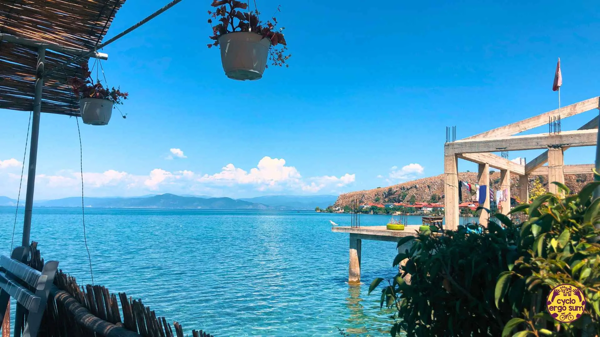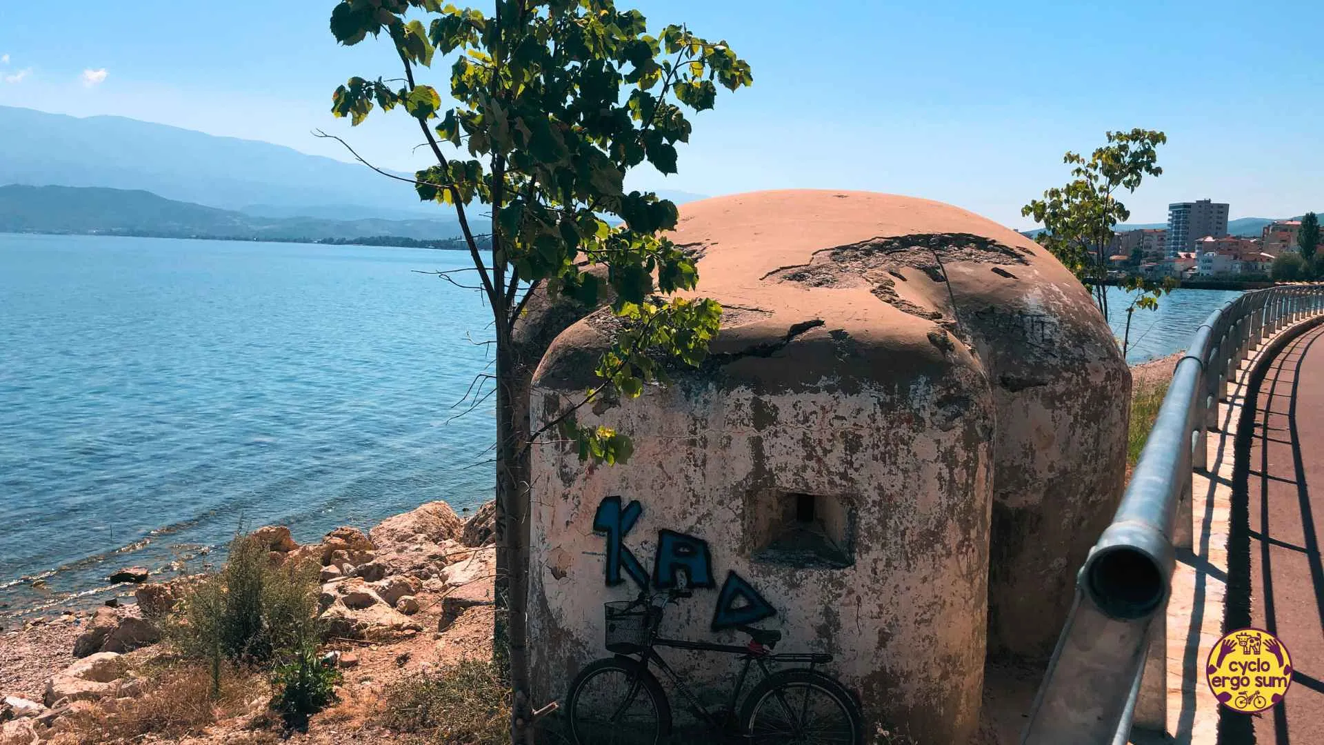 La ripartenza da Korçe ci porta a viste di bunker e campi coltivati, in realtà bucoliche placide, fino al passo che permette di vedere il lago di Ocrida. Questo, che è il lago più profondo d’Europa, si trova in una fenditura della terra – solo il lago Baikal in Siberia è ancora più profondo e più grande. La specialità di pesce del lago di Ocrida è la trota Koran, una specie di trota endemica e dal sapore gustoso. Dal lago di Ocrida, pedalando su una comoda pista ciclabile, arriviamo al villaggio di Lin. Da qui affrontiamo una lunga e trafficatissima discesa verso Elbasan, città storica nota per la sua fortezza.